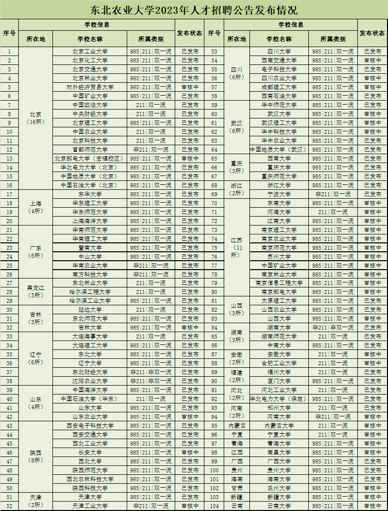 强化人才招聘宣传力度,推动树立“招人引才”工作新理念。学校强化“走出去”“引进来”招人引才工作理念,加大招聘工作宣传力度,校领导、职能部门负责人、各学院党政领导和教职工组成的招聘宣传团队奔赴于全国各地,参加了涵盖东北、西北、西南、华北、华东、华南、华中7个地区29个城市56所高校人才招聘双选会并举办了东农专场宣讲会,发出招聘宣传手册7000余份,成功洽谈对接南开大学、厦门大学、北京师范大学、西北农林科技大学等多所高校优秀毕业生。积极联系沟通多家招聘网站和媒体资源同步推送学校招聘公告,面向104所“双一流”建设高校和部分重点高校毕业生就业信息平台发布招聘信息,扩大了人才招聘宣传覆盖面和影响力。