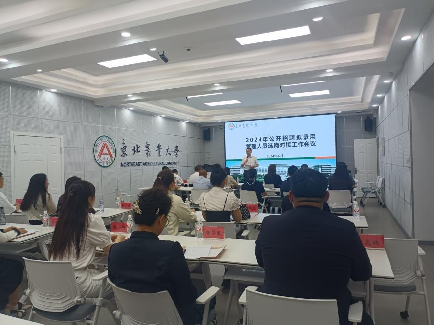按照东北农业大学 2024 年管理人员公开招聘工作整体安排,6月13日下午,人事处(党委教师工作部)在主楼834室组织召开2024年公开招聘拟录用管理人员选岗工作会议,各用人单位相关负责同志、人事处有关领导及拟录用人员参会,会议由人事处(党委教师工作部)处(部)长吴立全主持。