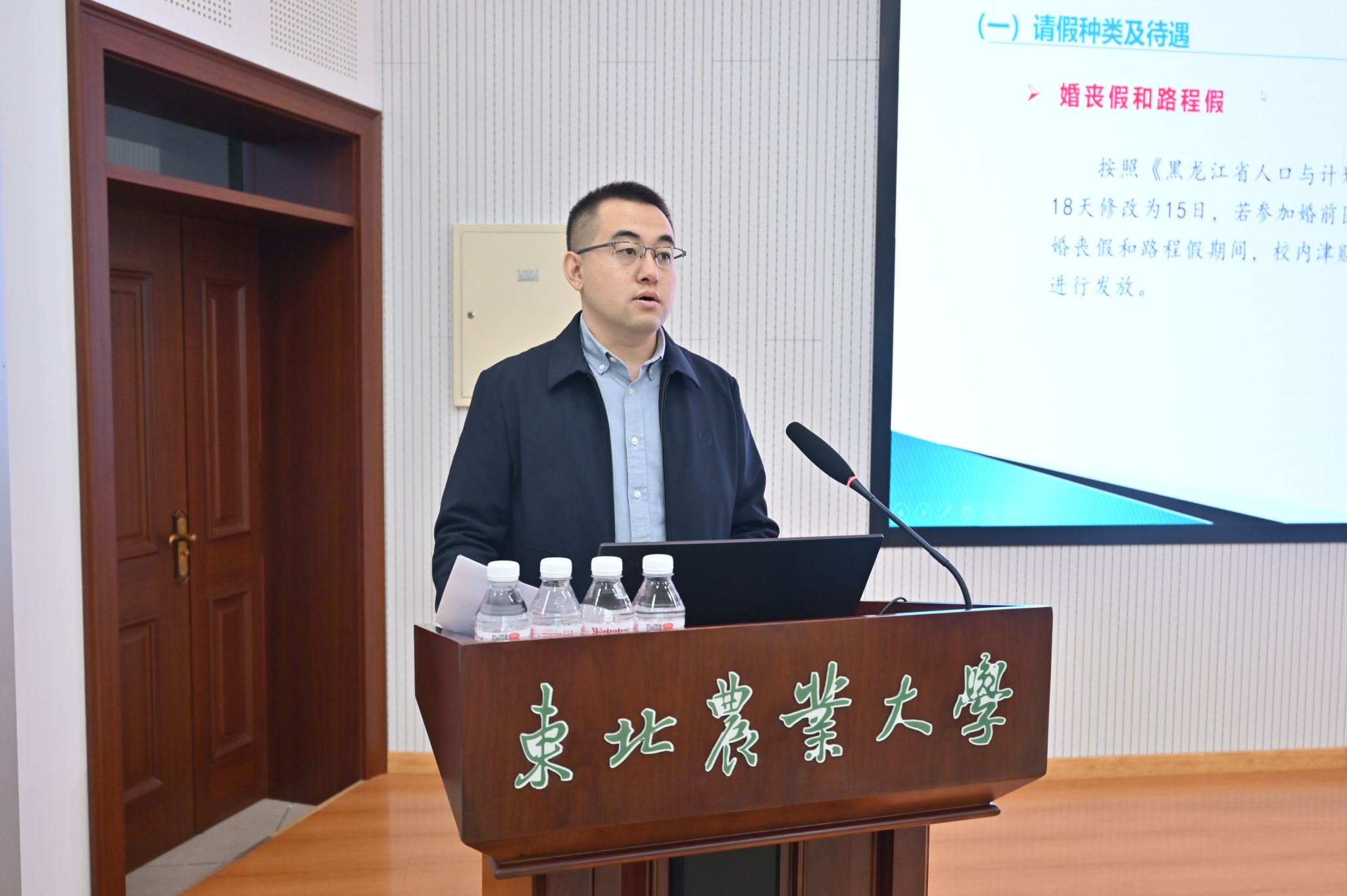 会上,关彦来分别从文稿框架、主要修订情况、参考政策依据、文稿内容等四个方面对《东北农业大学教职工请假及考勤管理暂行规定》进行了详细解读。对教职工请假种类及待遇、请假手续及批准权限进行逐一说明,并对各单位承担的教职工请假及考勤管理主体责任进一步明确。强调了规范请假制度,严格教职工考勤管理,对维护学校正常工作秩序的重要意义。