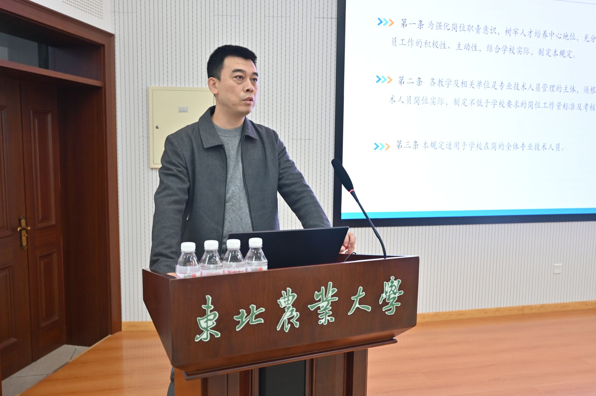 人事处副处长窦大昶对《东北农业大学专业技术人员岗位基本工作量暂行规定》的文稿框架和重点内容进行解读,并着重对专业技术岗位基本工作量制定的目的意义以及各类专业技术岗位基本工作量的具体算法进行了解释说明。对优秀引进人才校聘教授、副教授职称晋升、岗位待遇等有关情况进行具体说明,并对操作流程及相关注意事项进行重点强调。