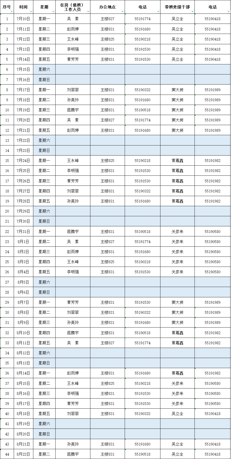 人事处(党委教师工作部)2023年暑假期间值班表